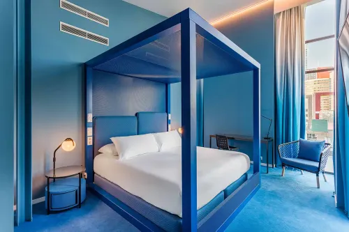 Wer Farbe liebt, ist im Room Mate Bruno richtig. Hellgelb, Limettengrün, Lila, kräftiges Rot und Babyblau bestimmen das Bild. Viele Zimmer sind komplett in einer Farbe gestaltet und wirken wie kleine Rückzugsorte. Das Hotel befindet sich in einem ehemaligen Teelagerhaus auf der Kop van Zuid. Das moderne Interieur bildet einen spannenden Kontrast zur historischen Fassade. Innen sind noch die ursprünglichen Betonpfeiler zu sehen. Die Lage auf dem Wilhelminapier zwischen moderner Hochhausarchitektur ist ideal. Katendrecht ist fußläufig erreichbar, das Zentrum liegt eine kurze Fahrt mit dem Wassertaxi entfernt.