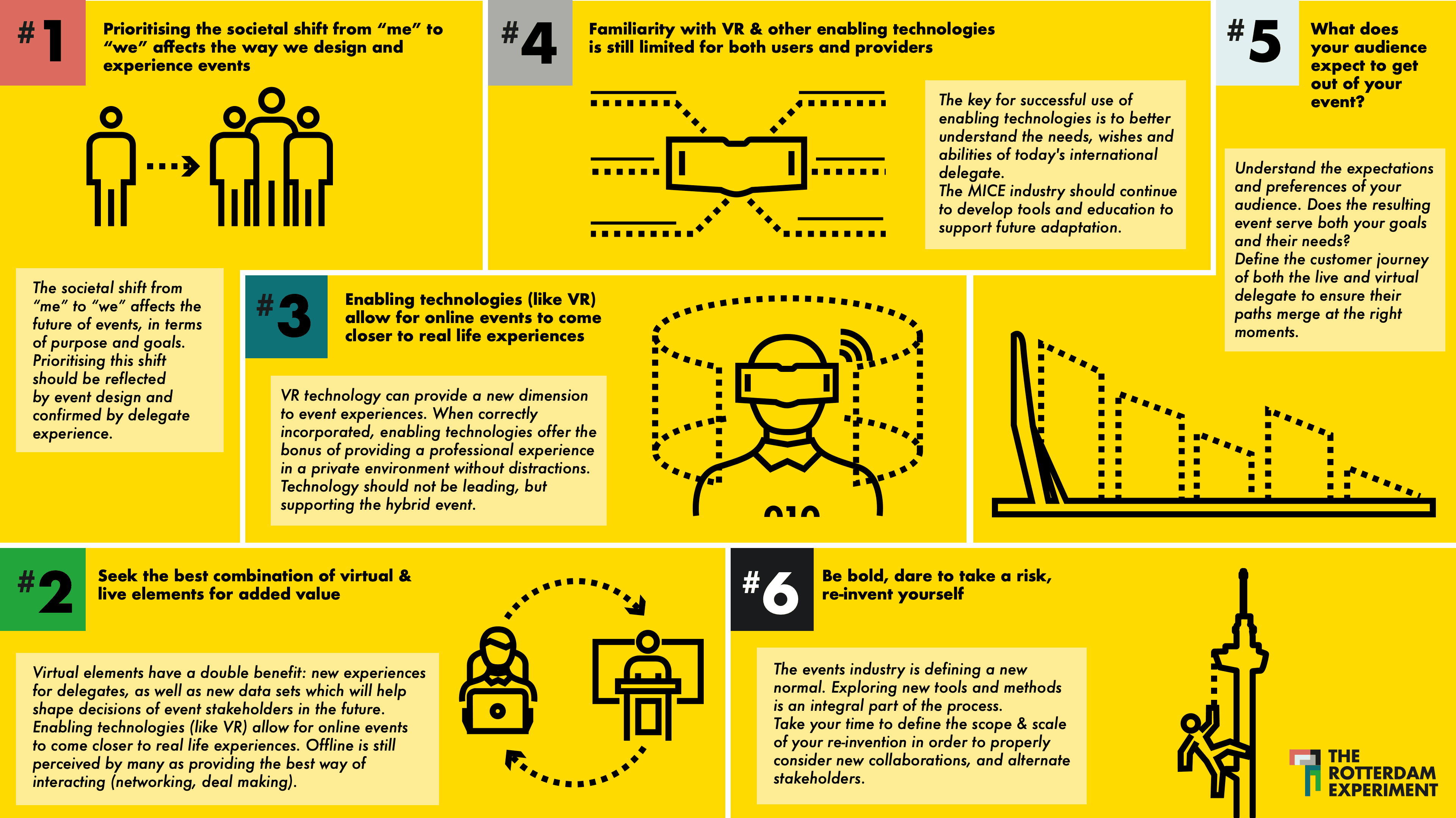 Like any good experiment, we collected real-time data and exchanged knowledge with each other. Experts from the events industry & beyond provided an interdisciplinary perspective of our findings, and together we built up cumulative knowledge needed to give shape the event of the future. Knowledge and insights gained through The Rotterdam Experiment was shared online.